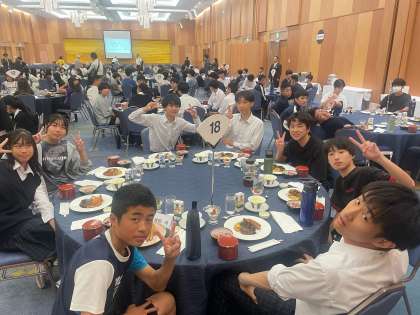 こちらのテーブルも笑顔が絶えません。こちらまでお腹がなりそうです。夕食会場は「光の間」です。学年レクもこの後、この会場で行います。