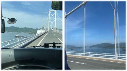修学旅行一行はバスに分乗し、来島海峡SAに向かっています。学年写真と2回目のクラス写真を撮影します。この絶景です、素敵な写真になりそうです。しまなみ海道、因島大橋からの絶景です。素晴らしい空と海です!!