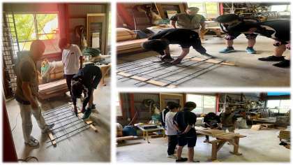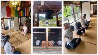 大洲地区の体験活動です。入村式で話してくださった住職の方のお寺です。坐禅を組んで説法を聞いています。普段していないことなので、坐禅を組むのも四苦八苦。農作業では、バジルやハーブの収穫を手伝っていました。晩御飯はピザだそうです。表札づくりにもチャレンジしました。