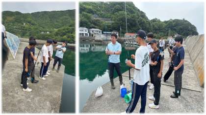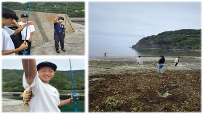 八幡浜地区の体験活動の様子です。釣り体験では、見事に釣上げました!すごいですね。豊かな海をきれいにするために、浜辺の清掃活動をしました。そして浜歩きは楽しいです。