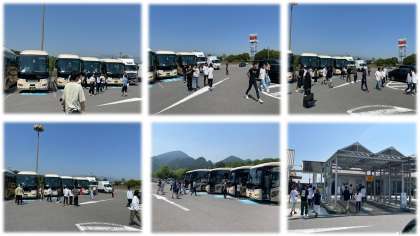 民泊先を後にした3年生は、松山自動車道を西に、いざラフティング会場に向かっています。途中、石鎚山SAでトイレ休憩です。石鎚山(いしづちさん)は、西日本最高峰の山です。天気快晴!ラフティング日和です!