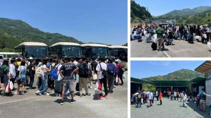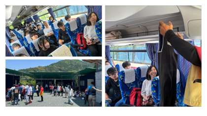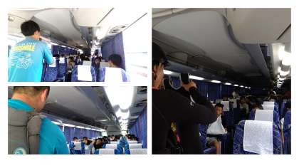 バス内で、ラフティングの説明を聞き、水着・ライフジャケット姿になって準備です。