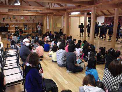 4月21日(土)お隣にある川岡東児童館の「おたのしみ会」に参加しました。この4月で開館1周年になる川岡児童館ですが、日ごろは、夕方からの時間帯に卓球をしたりおしゃべりをしたり、中学生もお世話になっています。朝早くから地域の方々も来られ、職員の方と一緒にカレーの炊き出しや受付のお手伝いをされいました。「おたのしみ会」のオープニングを飾っての吹奏楽部の演奏です。「勇気100パーセント」「ヤッターマン」「ウィーゴー」の3曲を演奏しました。どれもテレビや映画でおなじみのアニメの主題歌です。演奏に合わせて大きな声で歌ってくれている子どもたちもいて、ホール内が楽しい雰囲気に包まれていきました。今日のようにどんどん子どもたちや地域の方々に演奏を聴いていただきたいと思いますので、学校のほうへご連絡ください。ご招待いただきました児童館・地域のみなさんありがとうございました。