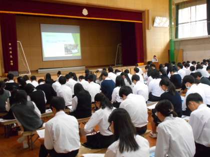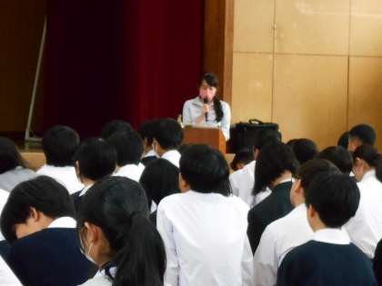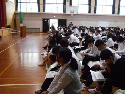 3年生は、修学旅行で平和学習を行いました。広島平和記念公園でのセレモニーは記憶に新しいところですが、本日は事後学習として、第25代高校生平和大使に選ばれた方をお招きし、平和学習講和をしてもらっています。広島・長崎のことだけではなく、ウクライナのことにも触れながら、平和大使の活動について、小さなことでも私たちができる平和についてお話しいただきました。平和は祈るだけではなく、実行していくことが大切です!!