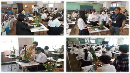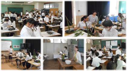 本日2年生は、伝統文化教育として、華道いけばな体験を行っています。北尾先生をはじめ未生流の先生方6名をお招きして、各クラス2時間の生け花を体験しています。日本の伝統文化ですが、普段なかなか体験しない本物の生け花は、新鮮で楽しい時間です。先生にも「上手です!」と褒めてもらい、真剣な顔と笑顔あふれるひと時を過ごしています。