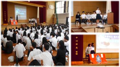 本日、1・2時間目は「令和6年度 生徒総会」でした。「To be ktrgw color〜つながろう 桂川〜」をスローガンに、生徒会本部・議長団を中心に素晴らしい集会となりました。各委員会の活動方針、学級討議で出された要望と返答、生徒会費決算報告と予算案。議長によるスムーズな進行で全校生徒が顔をあげ参加する姿は、さすが中学生と感じる雰囲気でした。