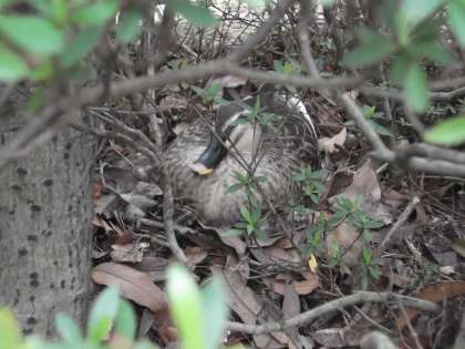 校門を入ったところの築山(植え込み)の中に、10日ほど前から、カルガモが抱卵しています。その周りは、部活動時のトレーニングや昼休みに遊ぶ生徒たちで結構賑やかな場所です。カルガモに気がついた生徒たちもいるようで、昼休みに植え込みの中をそっとのぞいている生徒も見かけます。新しい生命の誕生を生徒たちとともに見守りたいと思います。