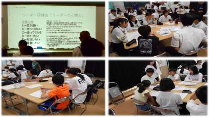 ディスカッションが始まりました。「こんなときどうする?」、ある事例をグループごとに協議します。中学生にサポートされながら、小学生もしっかりと発言し、リーダーとしての心構えについて意見交流します。最初は緊張した空気が徐々にほぐれていき、活発に声が聞こえています。
