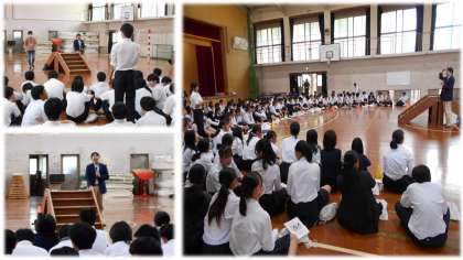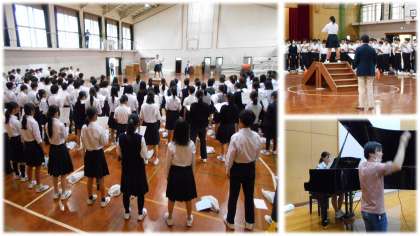 本日3・4時間目に、合唱指揮者の伊藤恵司先生にご講演いただきました。2年生の学年合唱曲「ほらね、」の作詞をされた先生です。先生は合唱指導の中で、歌い方、指揮の仕方、この曲の意味など、たくさんのことを2年生のみんなにご指導くださいました。2年生の合唱はどうですか?たずねると、すぐに「本当に素晴らしいです。」「私も楽しかったです。」と2年生が合唱に取組む姿勢に感動されていました。とてもいい時間を過ごすことができました!