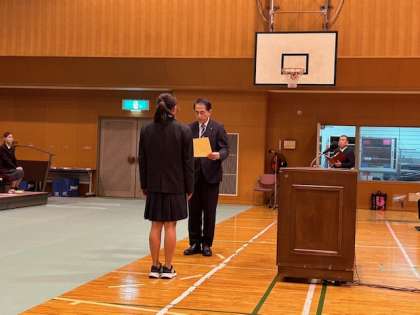 24日(木)午後4時30分から、京都市総合教育センターにおいて「令和6年度京都市中学校体育表彰」の式典が行われ、本校からは水泳部2年生女子1名および水泳部3年生男子1名が表彰されました。おめでとうございます!!今後も継続して練習に励み、更に力を高めていってください。