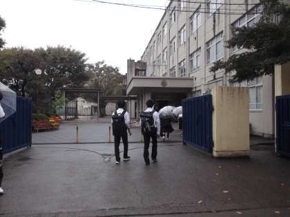 本日28日(月)、朝の登校の様子です。本日は昨日からの雨が残っている中での登校となっています。体調だけは十分に注意してください。今週31日(木)、いよいよ合唱コンクールが開催されます。今までの練習の成果を発揮し、クラス一丸となってがんばってください!