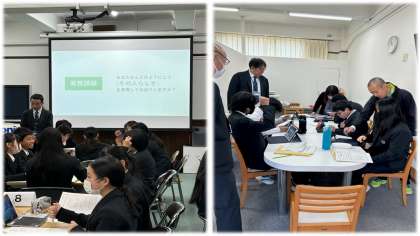 1年生は朝から、生き方探究館に体験学習に行っています。来年度の「生き方探究チャレンジ体験学習」に向けた取組です。職場での業務や就活準備の実践体験をグループに分かれて行っています。今日は1・2、4・5・6組が、来週月曜日に3・7・8組が体験学習を行います。