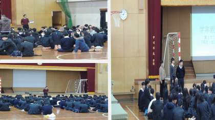 本日23日(月)1限、3年生は2学期のまとめとなる学年集会を体育館で行いました。学年親睦会で交流をした後、先生方からのお話がありました。いよいよ12月も残りわずか。受験前の大切な時期です。体調には十分に気を付けて、冬休みを過ごしてください。そして、卒業までの3学期を充実したものにしていきましょう!