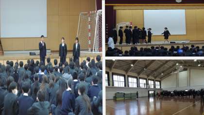 本日23日(月)2限、2年生は2学期のまとめとなる学年集会を体育館で行いました。各クラスの協議員が2学期の振り返りをしました。後半は学年レクレーションで大いに盛り上がり、学年全体の親睦を深めました。最高学年である3年に向けて、3学期も2学期以上に充実したものにしていきましょう!