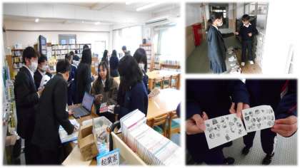 グレードアップ週間の最終日となりました。体育館と図書室は、生徒たちでにぎわっています。学年フロアや教室には、ベルスタすごろくのクイズやそうじ強化ウイークなどの掲示物がはられています。あいさつスタンプ、たくさんもらいました!!
