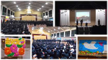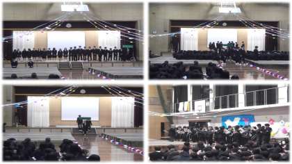 送る会のスタートです!3年生は舞台から登場し、会場の1・2年生に一礼し席に着きます。体育館は綺麗に装飾され、吹奏楽部の演奏に乗り会場の雰囲気は最高潮です!