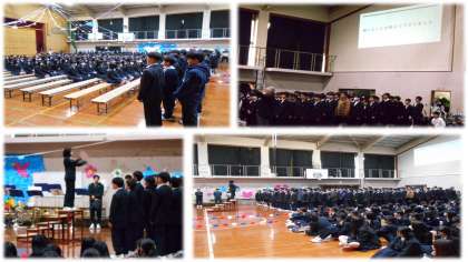 生徒会のオープニングで会場は一気に笑いに包まれました。1年生の発表はリコーダーの演奏での群読、いきもがかりの「笑顔」の合唱でみんなが笑顔に、人文字の「ありがとう」には、3年生から「オーー」と歓声が起こりました。