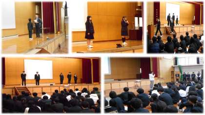 1年間最後の日です。先日卒業した3年生に続き、1・2年生がそれぞれの学年を終了しました。生徒会からは、全校生徒へご協力の感謝と卒業生から引き継いだ責任について発表がありました。生徒指導部長からは、3年生送る会で1・2年生の頑張りが光っていたことを話されました。校長先生からの最後の曲は「正解」でした。合唱コンでも聴いた歌詞に、2・3年生になる生徒たちへメッセージを込められました。全校生徒、教職員もじっくり聴き入っていました。1年間のしめくくりにふさわしい素晴らしい式でした!
