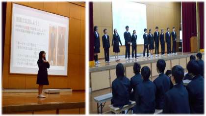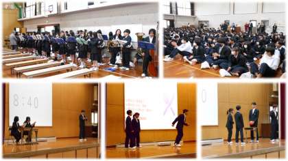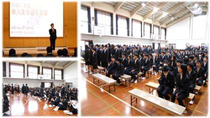 本日は「新入生を迎える会」でした。2、3年生の大きな拍手と吹奏楽部の演奏で体育館に入場です。まず最初に、生徒会本部が学校生活について寸劇で分かりやすく説明をしてくれました。笑いあり、緊張していた新入生は、一気にリラックスした雰囲気になりました。服装の着こなしやベルスタ、校歌もしっかり聞くことができました。