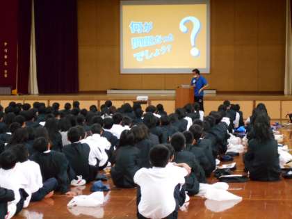 本日4時間目、1年生は体育館に集合して「携帯電話教室」を行いました。生徒指導主任の先生から、携帯・スマホの利用の仕方について、実際に起こった事件やトラブルのVTRを視聴しながら考えました。各ご家庭でも「携帯・スマホのルール」を是非作ってください。