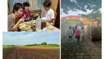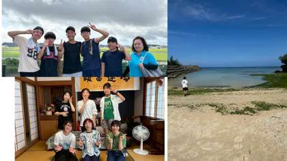 はいたい!天候は曇りですが,笑顔がこぼれています。三線を弾かせていただいているところや,農業体験をさせていただいているところなど様々です!