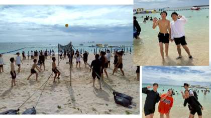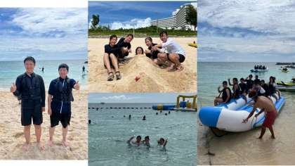 はいさい!マリン体験ハッスルしています。ビーチバレーも白熱です。砂に埋まったり埋めたり…。「今」この時を大切に!