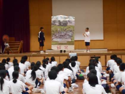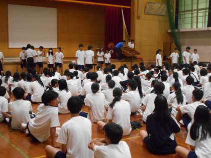 3時間目は、3年生の集会です。学年目標「結笑」が修学旅行の集合写真のデザインで完成しました。学年代表の生徒が、「1学期で『笑』は、修学旅行をはじめたくさんの場面で見ることができました。2学期は『結』のつながりを頑張りましょう!」と発表しました。生徒中心の素敵な集会です。後半は、借り人(ひと)競争?!で盛り上がっています。