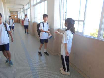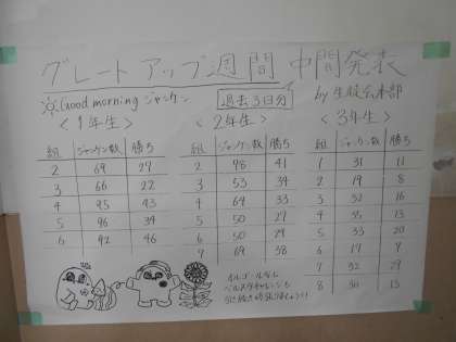 今日、生徒会長に「校長先生、グレードアップ週間どうでしたか?」と聞かれました。「先日行われたGAWAラリーもそうですが、モーニングじゃんけんゲームなど、つながりの学期にふさわしい生徒会の取組に感謝しています。ありがとう。」と答えました。「ありがとうございます。うれしいです。」と笑顔で返事をくれました。生徒会長を中心に生徒会本部の意識の高さを改めて感じた瞬間でした。