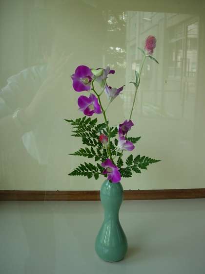 今週は、以前にも生け花に使っていただいた、ランの一種”デンファレ”と先週の”千日紅”を中心に、”レザーファン”を飾っていただきました。レザーファンはオシダ科の植物で、全体が三角形になる深緑色の葉が特徴です。水揚げが良く、長く持つので、生け花によく使われます。夏の名残と、秋へ向かう爽やかさが感じられる生け方ですね。