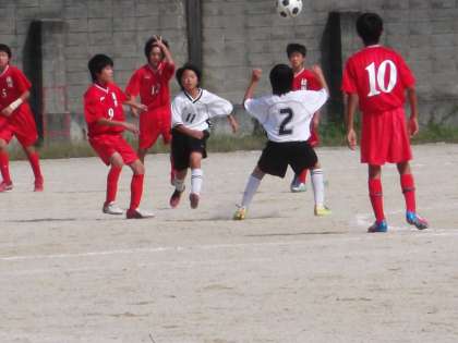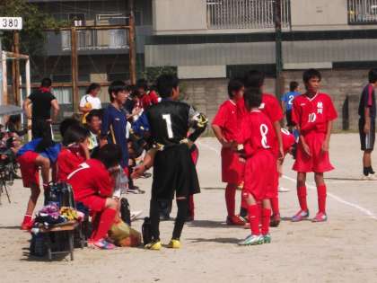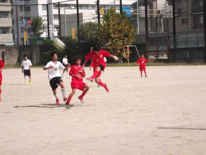 予選1位通過をかけて、北野中学校と対戦しました。4戦全勝同士の直接対決です。立ち上がりから積極的に攻めますが、最後の詰めが少し甘く、シュートがキーパーの正面をつくなど、得点が奪えません。相手の攻撃に対してもからだを張った守備で得点を許さず、一進一退の攻防が続き、前半を0−0で折り返します。後半途中から相手のサイド攻撃に苦しむ場面が増え、ついに右サイドからの攻撃に得点を許してしまいました。まだ時間もあったので、何とか同点に追いつこうと必死に攻撃を仕掛けますが、1点が遠く、1−0のまま試合終了のホイッスルが鳴りました。午後からの京産大附属中学校との試合は引き分けに終わり、4勝1敗1分で予選を2位で通過しました。決勝トーナメントでは、今日の敗戦を糧に、悔いのない試合をして下さい。
