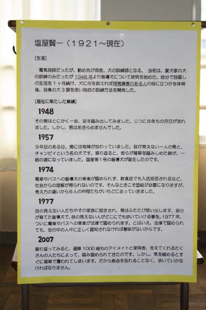 6組は「塩屋 賢一」さんです。塩屋さんは、視覚障害のある人のために、盲導犬の訓練方法を開発し、それを広めて多くの盲導犬を育ててこられました。