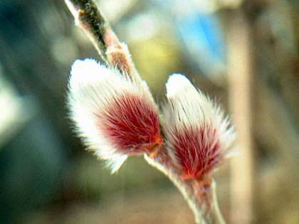 赤目柳は、ヤナギ科、ヤナギ属の植物で、生け花にはよく使われます。正式名はフリソデヤナギ(振袖柳)と言います。1981年に「ヤマネコヤナギ」と「ネコヤナギ」の雑種であると確認されました。冬芽が紅色なので花屋さんでは「赤目柳」と呼んでいるようです。花言葉は、「神秘的な人」です。春芽は右下の写真のようになります。