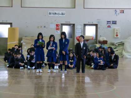 さて本番です。まず最初に他の校区から転校してきた4名の生徒を紹介し、挨拶をしてもらいました。4名とも緊張の表情でしたが、今日を境にすぐに学年にとけ込んでくれると思います。次に川岡東小⇒桂東小⇒川岡小の順で発表が始まりました。代表者の人が時間をかけて、各学校の様子を分かり易く紹介してくれました。続いて校歌の発表です。各小学校毎に分かれて整列し、何と伴奏なしのアカペラで、それぞれの小学校の校歌を歌ってくれました。どの学校も声がしっかりと出ており、素晴らしい出来栄えでした。気が早いようですが、今年の学校コンクールが楽しみです・・・!