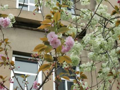 この北東の角に「御衣黄桜(ぎょいこうざくら)」と名札が張られた桜の木があります。この桜は、四月下旬ごろより咲き始め、花びらは開花につれてわずかではあるが、緑⇒黄⇒ピンクへと色を変えていきます。そして、やがて花ごとポトリと落ちるというそんな珍しい桜です。土曜日に見学に行くと、満開の花を咲かせていました。隣に咲いているピンク色の桜と比べてみると、その色の違いがわかると思います。