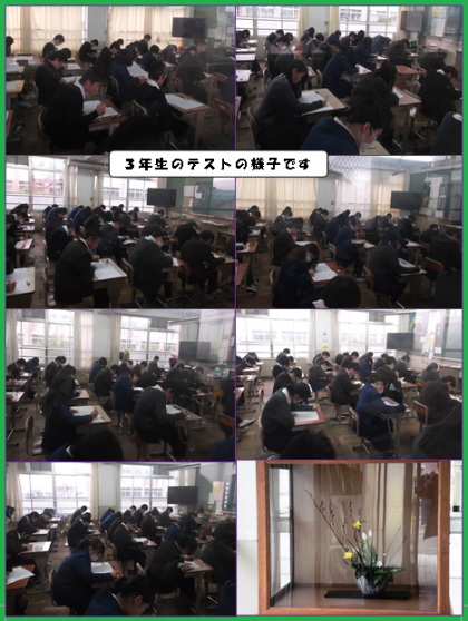 1月18日(月)から3年生の定期考査5が始まりました。みんなとても集中して問題に取り組んでいました。中学校での最後の定期考査です。悔いの残らないように全力で取り組みましょう。ファイト!