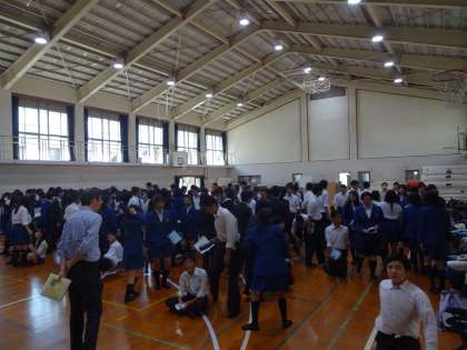 5月18日6時間目に体育館で、修学旅行に向け、集団訓練をしました。200名以上の生徒・教職員が集まったり、移動したりすると、どうしても時間がかかります。無駄な時間をなくすことや、一番に参加している全員がその場にいて、安全が確認できるかが大切になります。今日の練習では、「また同じ隊形にもどるの?」との声がありましたが、学校外での雑踏の中では、指示する声も聞き取りにくく、個々がしっかりと動きをわかっていなければなりません。きっと今日の練習が無駄ではなかったと思ってくれることでしょう。全員無事に、楽しい思い出をお土産に修学旅行から戻ってきてくれることを願います。