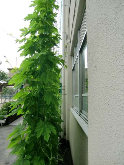 ”かつら川グリーンカーテンプロジェクト”も開始から3週間が過ぎました。この1週間は、毎日雨が降る典型的な梅雨の天気であったこともあり、カーテンはグングンと上に伸び、ついに2階に到着です。このカーテンのおかげで、1階は涼しくなっているようです。次の目標は「2階を制覇して3階に到着!」です。夏休み中には実現できると思います・・・。楽しみに!