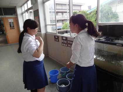 ある放課後,水槽を掃除してくれている生徒がいました。藻だけだと思っていた水槽に実は,小さなエビがいたのです。
