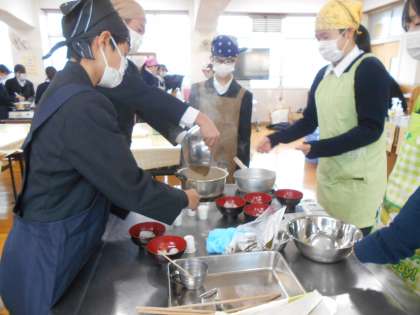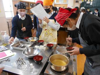 先週から2年生が家庭科の授業で「京風お雑煮」の調理実習を行っています。白みそ仕立てのだしに、やわらかい丸餅と彩り豊かな野菜を加え、京都ならではの味わいを再現しました。生徒たちは、だしの取り方や食材の切り方に気を配りながら、協力して調理を進めました。「おいしくできた!」「家でも作ってみたい!」という声も聞かれ、笑顔あふれる実習となりました。日本の食文化を学びながら、仲間と協力する楽しさを感じられる貴重な時間でした。