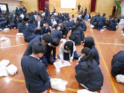 2時間目は2年生です。学年代表の生徒から「男女の仲の良さを、行事の時だけではなく出せたらいい」とありました。学年の先生から「明日からできる身だしなみや言葉遣いのこと」、学年主任の先生からは「空気を変える、空気を作る」話がありました。3年生をリスペクトしながら、来年の空気を作る準備の集会でした。後半は、全員レクで男女の仲の良さが出ていました!