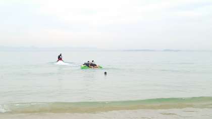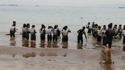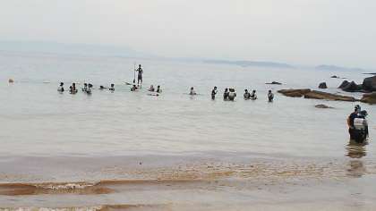 マリンスポーツ体験の様子です。シュノーケリングとビスケットボードを楽しんでいます。