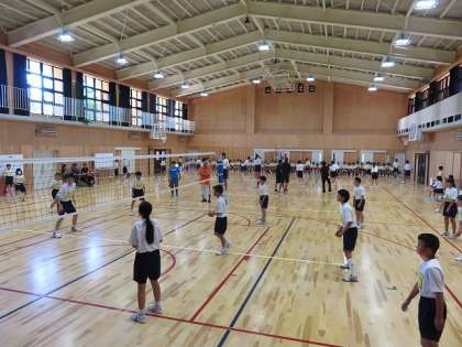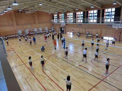 2年生がチャレンジ体験、3年生が修学旅行に行っている本日、体育館では1年生の球技大会が行われています。男女混合のバレーボールです。みんながんばれ!