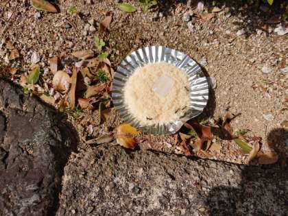 実はゴマが一番に減りました。もっと甘いものに群がるものと思っていましたが、さにあらず。人間の手が入りすぎているものは、アリが好まないのかもしれませんね。自然に生きるもののたくましさを感じました。アリたちはゴマで元気が出たのか、虫の死骸もせっせと巣穴に運び込んでいました。
