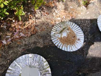 1組の理科の時間です。アルミフォイルの皿に、さまざまな物を乗せてアリを呼び寄せています。氷砂糖、三温糖、グラニュ糖、塩、ゴマ、片栗粉などなど。アリに人気(アリ気?)だったのは何でしょうか?