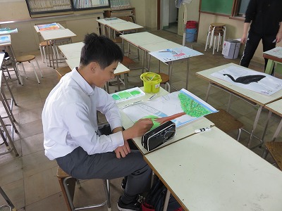 美術部は,新緑の爽やかな風が入る美術室で,5月10日からはじまる愛鳥週間のポスターづくりに励んでます。