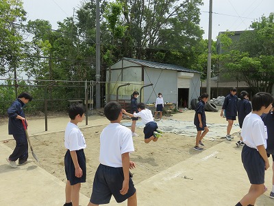 4時間目グラウンドでは1年生がハンドボール投げと立ち幅跳びを行っていました。