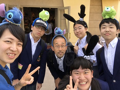 ディズニーランドの天気は快晴,体調不良の生徒もなくみんな元気です。