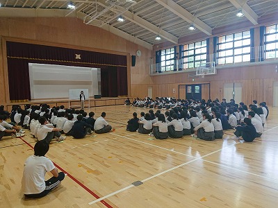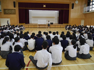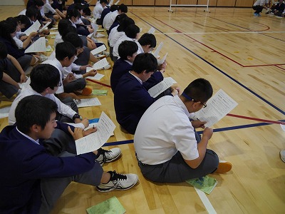 これから,修学旅行2日目の班別研修学習発表ポスターの作成をします。ポスターの作成方法や作成のポイントを体育館で聴き,その後各教室で作業をスタートします。