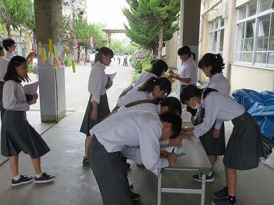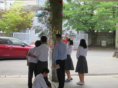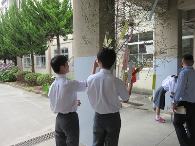 笹の周りには,短冊をつけようと多くの生徒が集まっています。