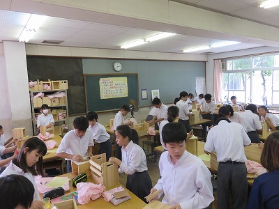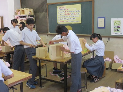 2年7組技術家庭科(技術分野)は,作品塗装の授業でした。ムラが出ないようにみんな丁寧に塗装を施しています。